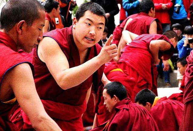 【辩经的手势意思】拍手心是表示提问,提问前要说一个“底”,右手扬起和左手相击发出清脆响声,将右手向下伸向对方后拉起。那一声“底”相当于开启智慧,佛教中文殊菩萨是智慧的象征,而高扬的右手说明文殊智慧就在身后。手背打手心是回答错误,全错就摸答者的头(在西藏,头是绝对不能随便去摸的)。