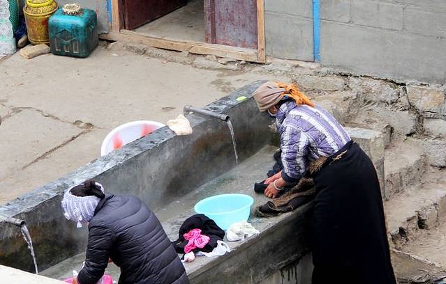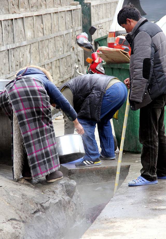 阿佳裸露上身,下身裹布,蹒跚的移动到池边。由于腿脚不便,下池的阶梯需要搀扶。这时总会有无数双手,伸过来扣紧阿佳的手指,引她走到池里最舒服宽阔的位置,用水瓢舀泉口热水替她润湿后颈后背。很多人一边泡着温泉,一边嘴里还在诵经🙏