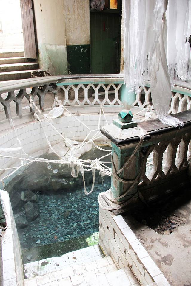 康布温泉共有十二眼泉水,最大的三平方左右,正上方开了与泉池同等大小的天井,环屋一周为入浴者的卧榻和大小不一的分卧室,由于疗效不一,泉眼又小,基本不男女分浴。