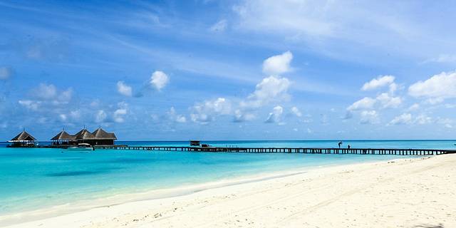 沿着廊桥走向尽头,踩在洁白的沙滩之上,抬头仰望碧海蓝天,如临梦境。