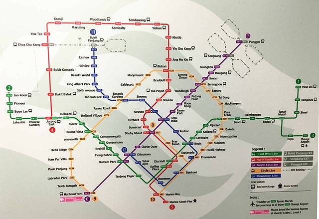 交通:在新加坡呆上5天或以上的建议买个公交卡,一出机场坐地铁前就能买到,有打折优惠具体没了解,一次充值只能充10SGD以上,停用时可以退卡,余额也退换。这边地铁很贴心,中文、印度文、英文,就算看不懂英文没关系,每个地铁站多有对应的号码,例如EW22之类的。
