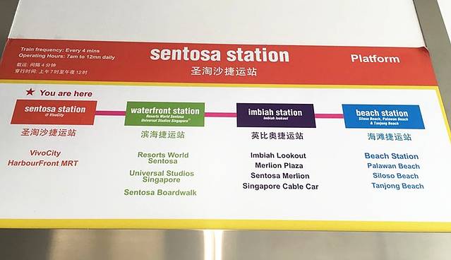 第二天前往灰常灰常期待的圣淘沙,其实这里就是类似一个小度假村或是一个岛,里面各种蛮不错的五星级酒店、环球影城等吃喝玩乐的地方,进去圣淘沙要4SDG的地铁票(从VIVO怡丰城商场三楼里乘搭),圣淘沙捷运站(首站、VIVO怡丰城)——滨海捷运站(环球影城、海洋馆、名胜世界)——英比奥站(鱼尾狮、花园)——海滩站,如果你想步行进去也可以,从VIVO怡丰城的一个后门走大约半小时就到环球影城,然后入住酒店后就出发环球影城。