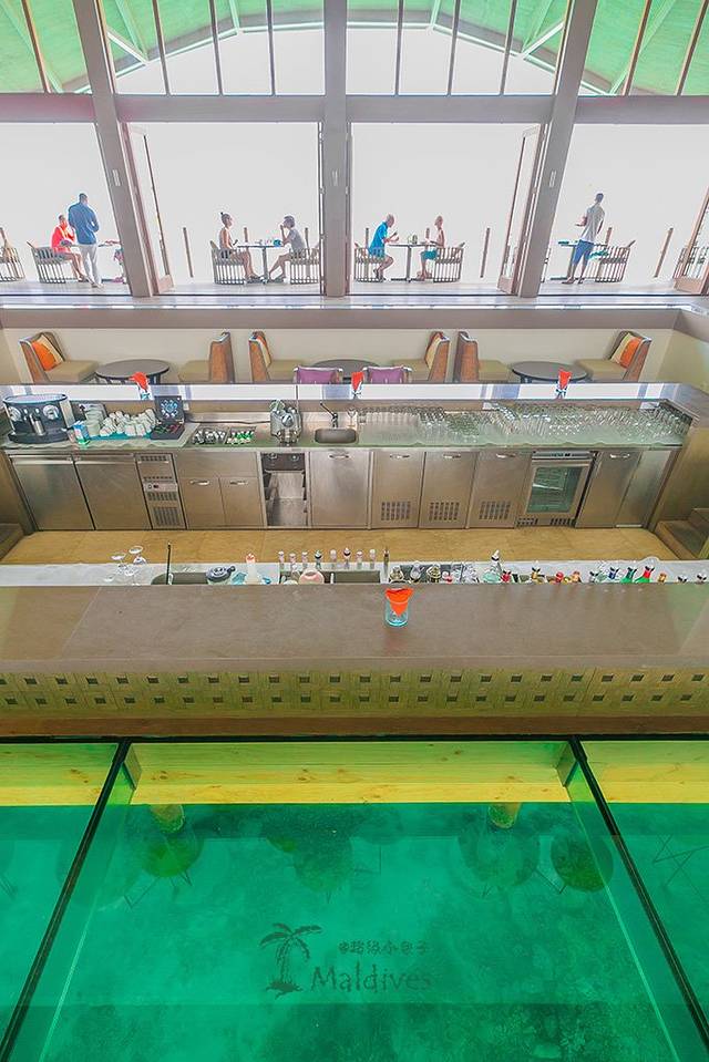 于是躲到岛另外一端的地方吃午餐,这整座餐厅都是完全架在水面上的。在餐厅的大堂里有一块玻璃地板,可以直接看到海底的景象。