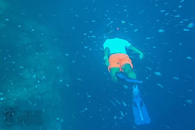 这样倒是也有好处,因为领队知道哪里可以看到什么样的海洋生物,所以这一趟也收获了不少。刚下水就有一大群蓝色的小鱼绕着我游来游去,不过水下当时能见度比较差,拍不出来。我们就这样沿着珊瑚礁的外沿一直往前游,珊瑚礁的内侧(靠近岛屿)水浅浪小,大概只有2、3米深,而到了外沿就突然向下陡降,最浅的地方也要10来米深,最深的地方从水面看不到底,向导说这里差不多有30米深。
