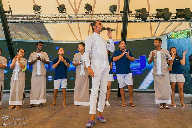 来了新客人,岛上的工作人员也是夹道欢迎,他们三三两两地位列两边,中间空出了一条通道,看这意思是让客人沿着这个方向前进,穿过一个宽敞的前院,来到后面的小舞台。看样子这里平时是用来表演节目的,待得宾客纷纷落座,工作人员也鱼贯入场,在台上站了一排,前面让出一个瘦高个子的白人,穿着一身白衣服,脸上也不知道是被晒的还是刚小酌了几杯,显得红扑扑的。他带着浓重的法国口音向大家做了个自我介绍,原来这就是本度假村的“村长”。Club Med是法国公司,来个法国人当村长倒也正常,不过哥们的英文法式口音实在是太重了,听得那叫一个费劲。他说得也费劲,本来法国人发音就有几个靠喉咙发出来的音,一般没学过都很难发得到位,他用这种发音习惯再配上英语的单词,听起来就像是有口痰一直卡在嗓子眼儿里似的,想吐又吐不出来。