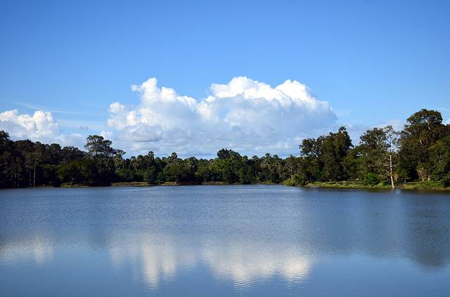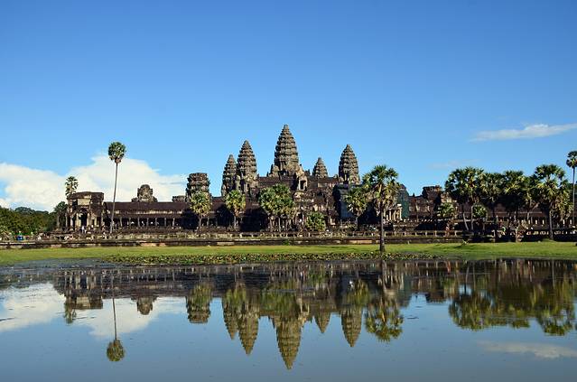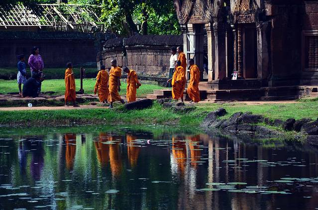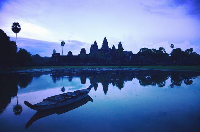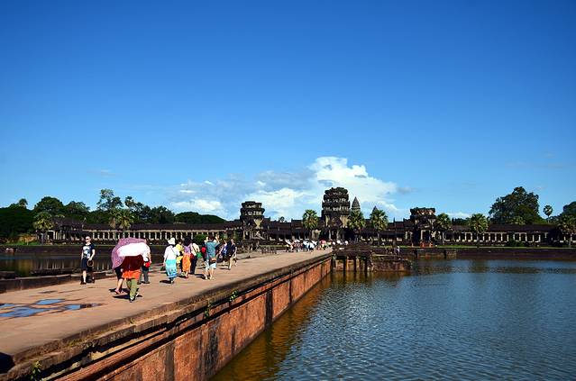 许多年前,在一本杂志上看到吴哥窟的照片,宛如五个玉米粒的佛塔倒影让我着迷,如泰姬陵一样,一见钟情之后便是长久的思念。