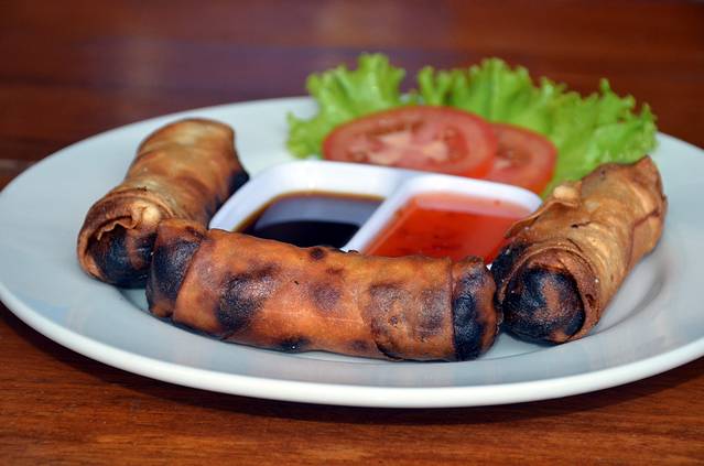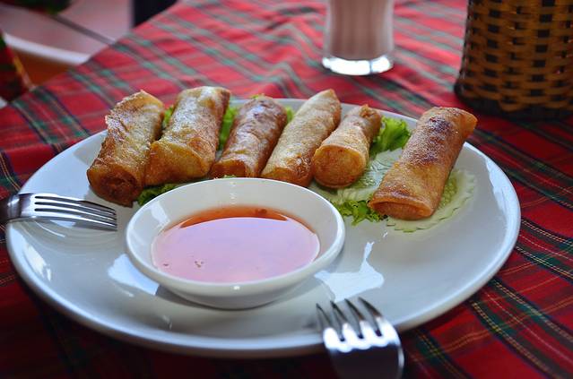 找了一家食客比较多的餐厅坐下,柬式炸春卷配了两种调料,外焦里嫩