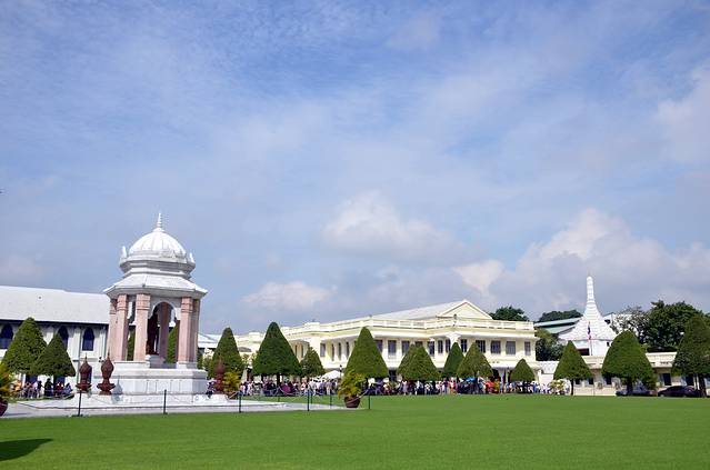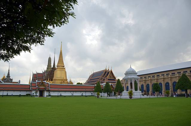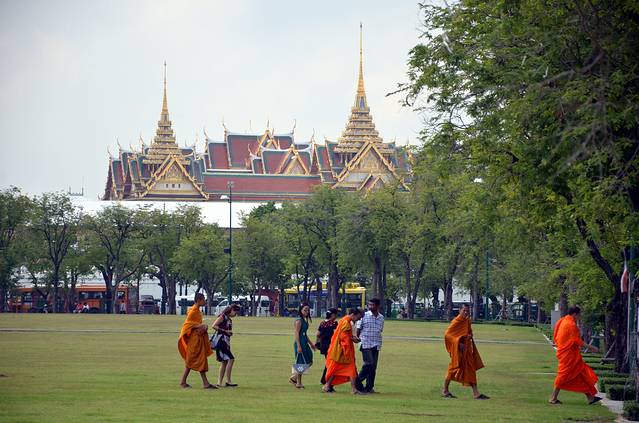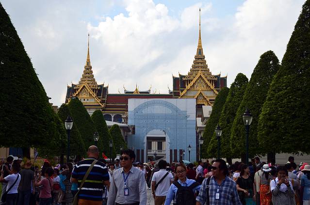曼谷大皇宫内一景,密集的人潮形成草地上的一条黑线