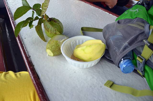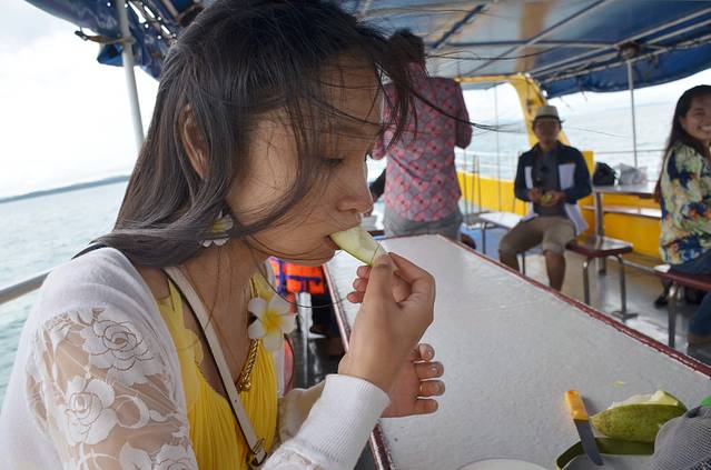 登船后,坐在2楼的甲板上吹风,旁边坐着几个柬埔寨当地小青年,男男女女,大概是相约去高龙岛郊游,带了许多食物,在甲板上有吃有笑,与他们聊天,热情的请我们吃青芒果,那语气,那期待的眼神,说好吃的不行不行的,还强调一定要蘸盐,才更突显美味。