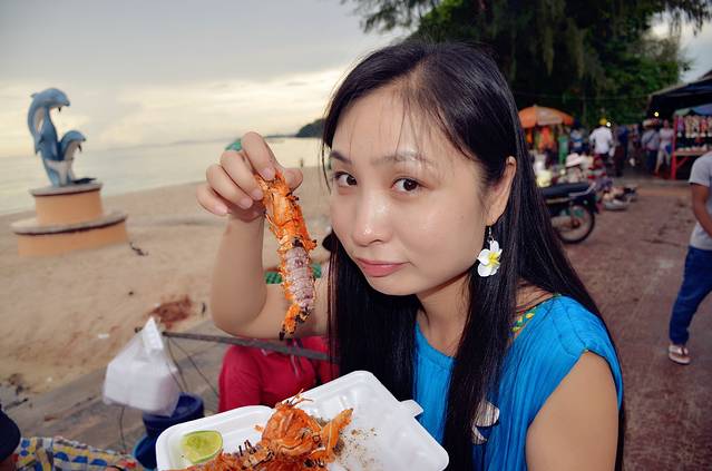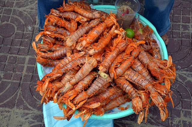 海滩边,有卖炸虾和烤鱿鱼的小贩,皆是一美金三个