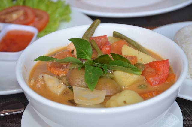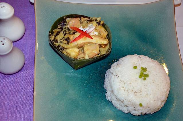 高棉红咖喱用椰汁做底料,浸在咖喱里的鸡肉,蔬菜味道清香,配上白米饭简直不能再赞。