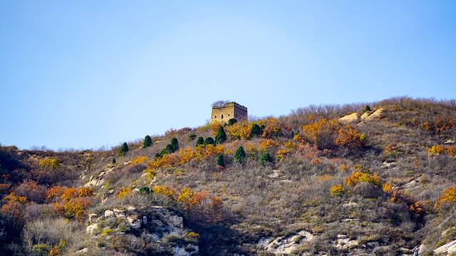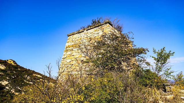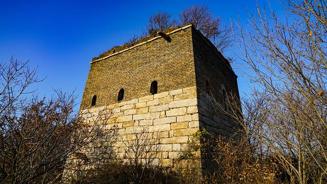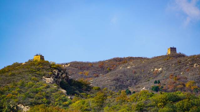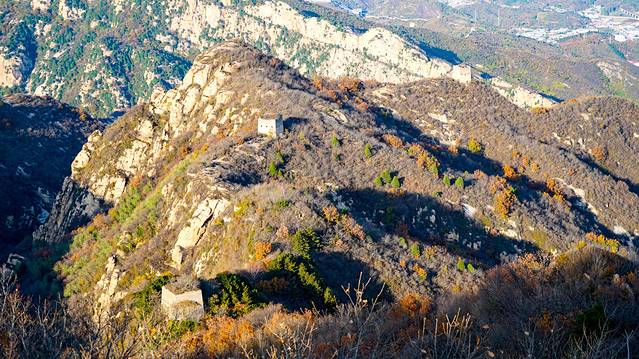 其实五座楼的入口就在水库西边的梨树沟村,进了村子能远远地看见山脊上的敌楼,不过受地形限制,刚开始的时候只能看见前三个敌楼。