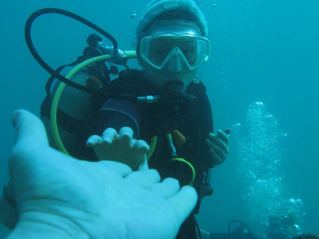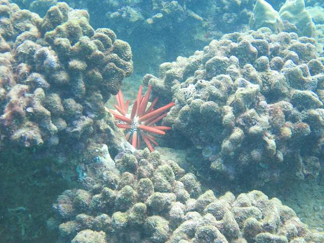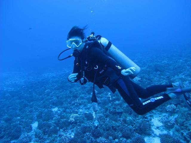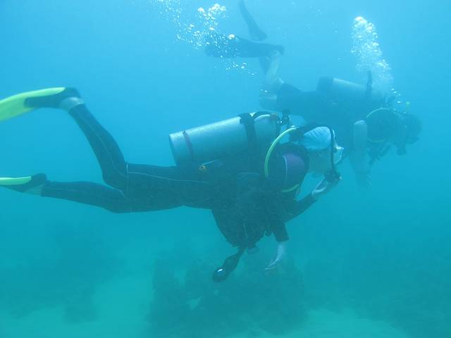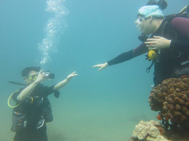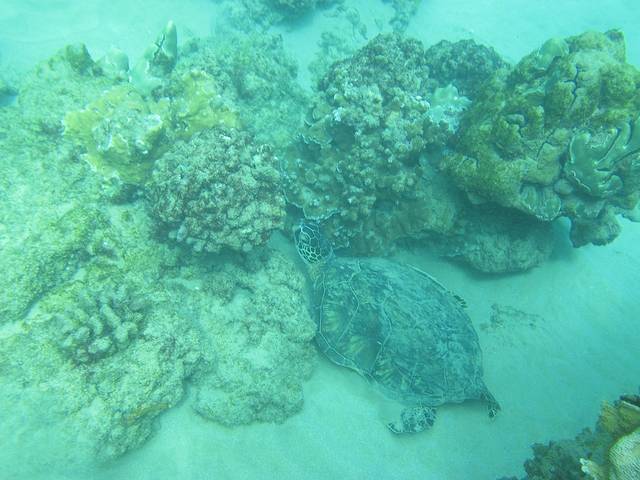 背着沉重的装备从沙滩走下水,先在浅水处练习熟悉一下。然后向深处进发。由于是靠近岸,所以水不是特别清,但珊瑚间也有一些漂亮的海星和鱼虾,更看到一个正在礁石间犯懒的海龟。略微屏住一下呼吸,有时还能听到鲸鱼的鸣叫声。