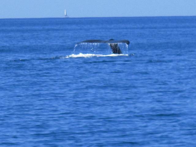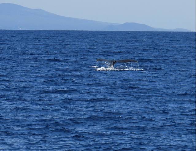 运气很不错,刚出港就看见2条鲸鱼双飞翻尾。船一路四处搜寻,远远近近看到很多鲸鱼,还放下声纳听鲸鱼的叫声。但鲸鱼似乎并不很喜欢有船靠近,而且它们吐水柱,翻身都很快,难以抓拍到好照片,更多是自己用眼睛欣赏了。