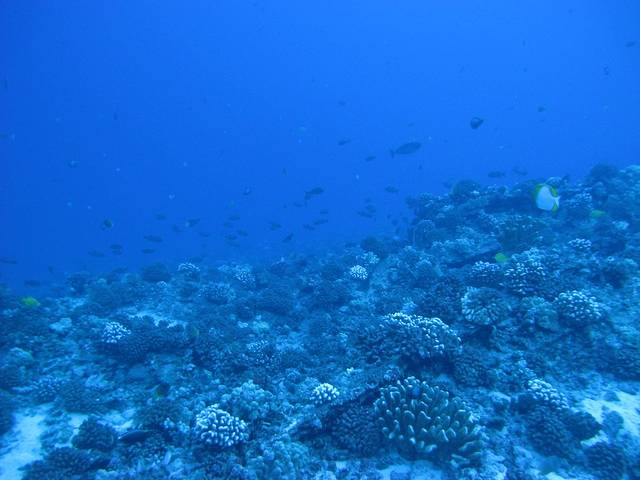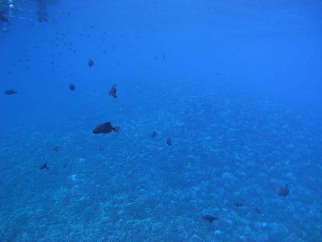 7点左右,到达Molokini Crater,夏威夷最著名的潜点。天刚开始朦朦亮。我们的船是最早到的。最后的嘱咐后,分3组,由3个导潜带领,大家背上气瓶戴上面镜,依次跨步跳入水中。还好,穿着潜水服不是特别冷。感觉依然有点紧张,但翻身向下看去,惊讶地发现水极其清澈,一眼可以清楚看到近20米深的海底,各种鱼在其间游荡。这种美景令我几乎忘了紧张,直到要开始下潜。调整一下心情,开始下潜。随着深度的增加,紧张感开始减轻。事实上这次潜水,我们的中性浮力和解耳压表现都不错,面镜也没找什么麻烦。之前的岸潜和练习颇有效果。