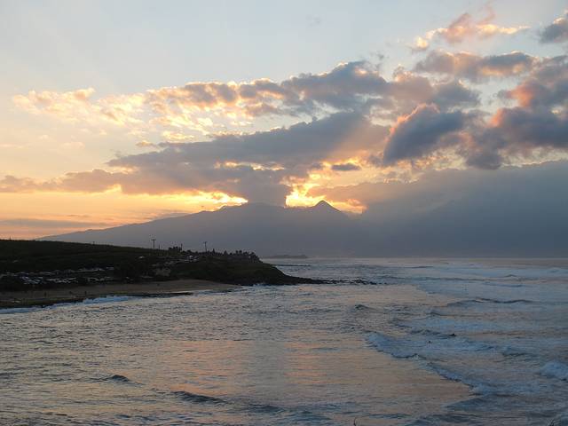 开出山路回到Ho'okipa Beach Park时,正逢日落,看漫天晚霞中,一群人玩冲浪,又欣赏了半晌美景。