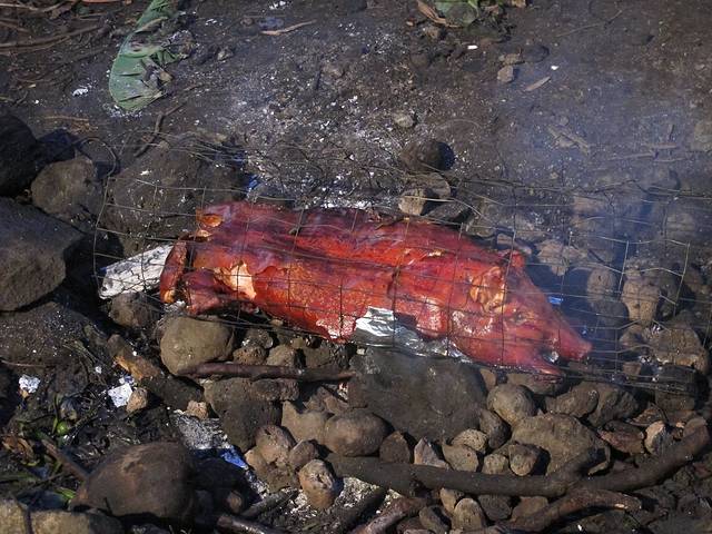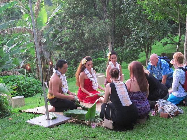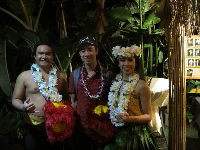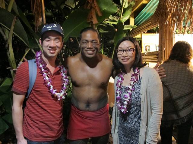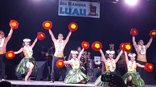 Luau原本是夏威夷人的一种交际宴会。不过如今客人都是游客了,即便是老外貌似也没有什么和陌生人聊天的兴致。半山间看出去夜景很不错,只是挺冷。我们忘了酒店的职员帮我们订这家Luau时“多穿点”的嘱咐。只好拿饮料券换两杯酒暖暖。烤乳猪很香,我们排了3回队领(每次只能一小块)。自助餐就一般了。重点是歌舞表演,这家的草裙舞和火舞据说是岛上最好的。