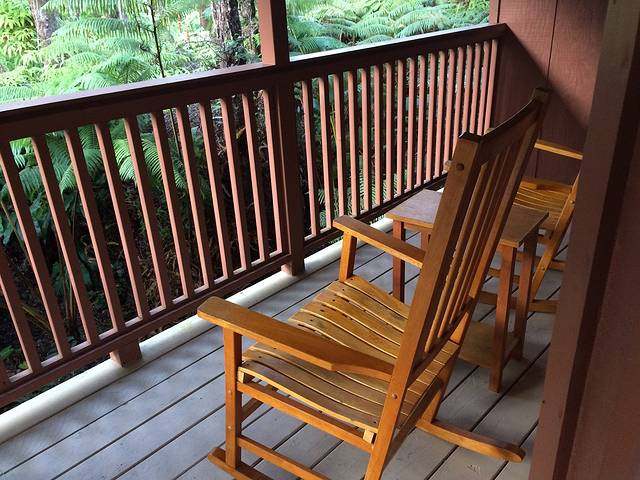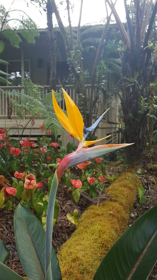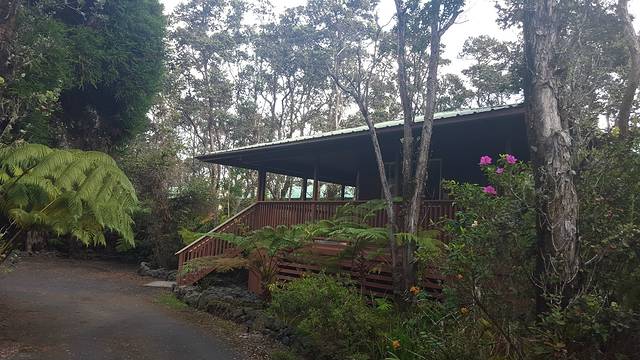 Volcano Country Cottages是在Booking.com上评分最高的火山镇的民宿,只有4间房。幸好我们订的时间不是周末。从Hilo机场到火山镇需要开不到一个小时。Volcano Country Cottages的入口在路边茂密的树丛之间,地上的牌子也很小,以至于我们绕着它前后转了半天才看见。
