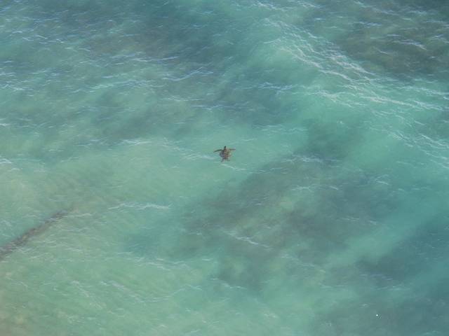 但还是有不少老外兴致盎然地冲下去浮潜。有啥好看的?我们站到稍高一点的岸边往水里细看,果然,海里游着许多的海龟!好在我们也带了面镜和呼吸管,更有浮潜用的胶鞋。穿戴上立刻冲进海里。看到海龟们慢慢地随着海浪游动,时而露个头,时而探个底,自在悠闲,但时而也会被大点的浪打个龟背朝天。有几只一度被冲到离我们只有一两米的地方,让我们近距离观察,很是可爱。我们很开心地在水里看了一上午,和其他下水的老外们相互指点发现的海龟。