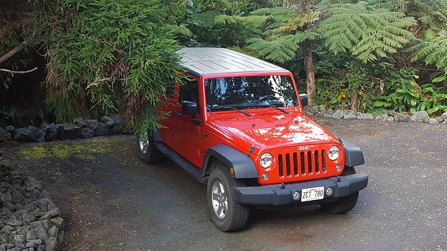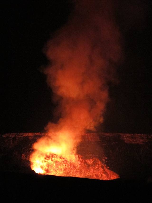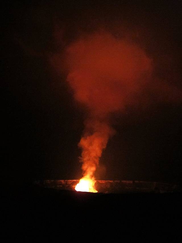 到晚上9点半,天已经全黑,按老板的推荐,出发进火山公园(这时候是不收门票的)。远远就看到半边的天都是红色。一路开到Jagger Museum,夜间欣赏红彤彤的火山口,很壮观。原本有环绕这个火山口的徒步路线,但是在前几年的火山喷发中被毁了。如今那半边的的路都封闭了。吸取在前两个岛的教训,我们把从北京出发时穿的羽绒服都穿上了,稍有夸张,但一点不热。后一天在火山公园里我们也都穿的长衣外套。