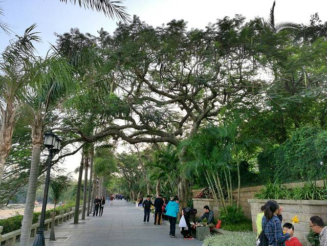这就是我们门前的那条沿海的路,前方通向皓月园,路两边有卖芒果的。这一大棵应该是皂角树。
