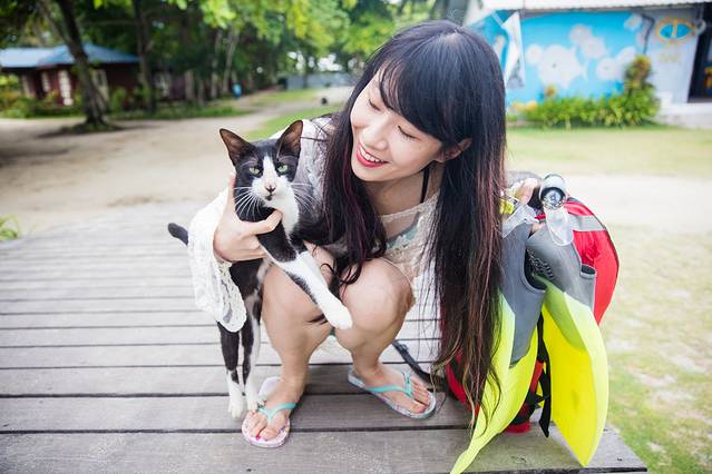 下水前偶遇流浪猫,仿佛在对小猫说“跟我去潜水呀”