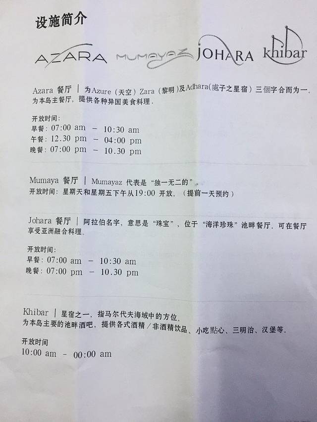主岛上有2个餐厅一个是Azara,一个是Mumaya。前者是沙屋的主要餐厅,周二有个特殊活动(额外加钱),具体开放时间下文会有图片,后者是特殊餐厅,周五周日特殊餐是开放,预定会送香槟,其余时间想开放的话你需要提前预定,但是不送香槟(由于准备餐需要3-4h,所以也需要提前最起码4h预定),价格有400刀/人,950刀/人,好像还有更高的,位置在沙屋16,17号屋那边,感觉特殊活动的菜不好吃,就是气氛比较热闹,感觉这边龙虾不放调料的。。。(可能950刀朝上的好吃吧)