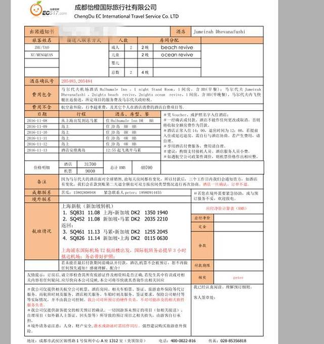 去马代,由于基本上是一岛游,所以不需要跟团导游,只需要帮忙预定酒店以及飞机机票,所以基本的代理就可以满足,当然如果你英文足够好完全可以自己搞定一切。关于代理,我是根据贴吧里的帖子以及价格还有就是某宝的付款记录等选定的,大家都可以和我一样诸多比较,我选的是怡橙假期,不过在这里我还是想提一下携程,他是切实在马累机场提供了中国人接机服务的,当时我下机找寻接机人员时她还很热心的帮我用英文和周边安保人员交流,铭记于心、十分感动。