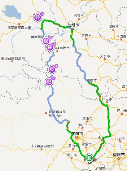 行程图分两张,一张是四川甘肃段,一张是青海甘肃段。整个行程以西宁为汇合点,程8字型路线。