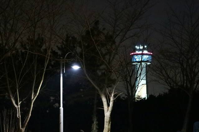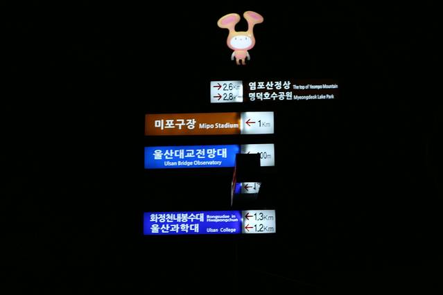 往蔚山展望台走的路上,就远远的看到了亮着灯的蔚山展望台高高的耸立在黑暗当中!黑暗这还有指示牌。。。