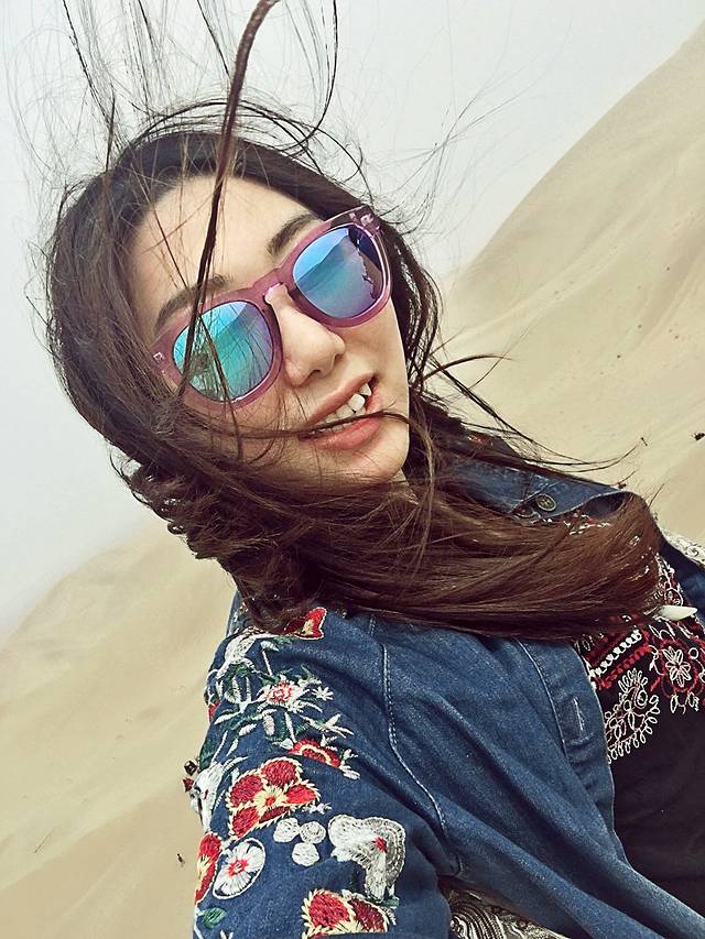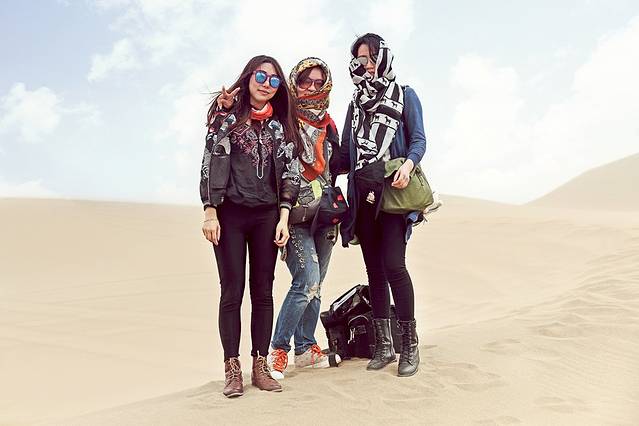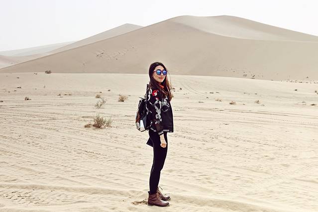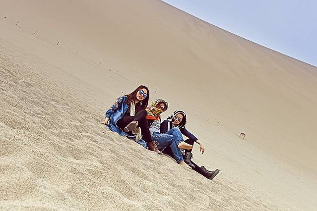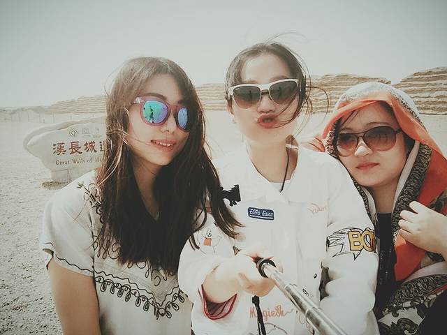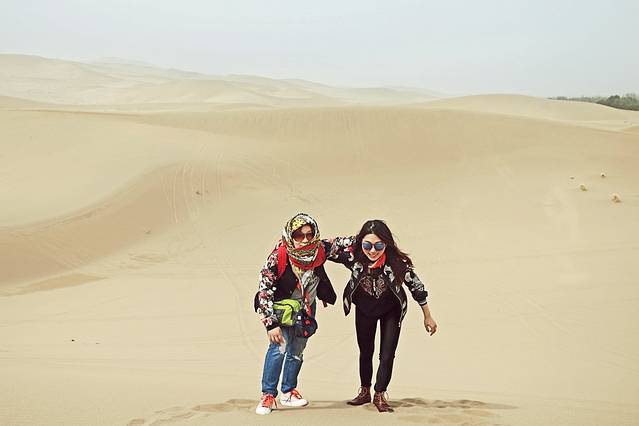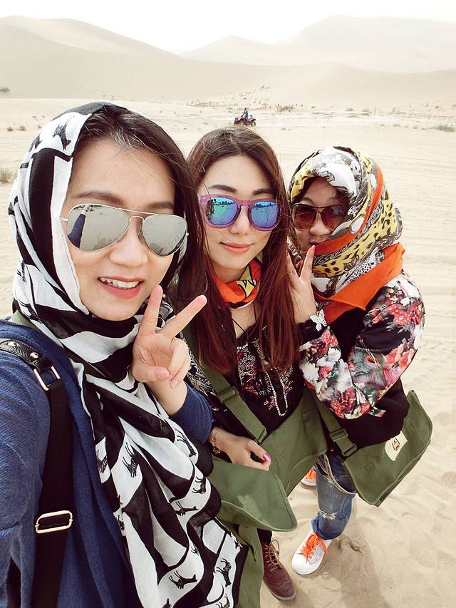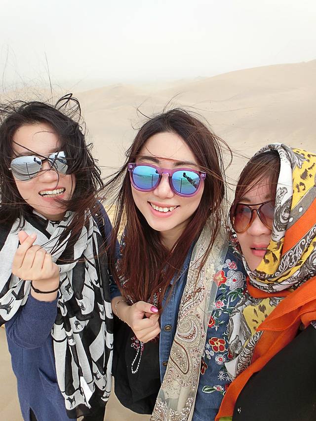 剧组所在的是鸣沙山山脉的一角,靠近一个骑行俱乐部,远远地就看见不少车停在门口。我们一下车就强烈的感受到风沙季的风是有多么的猛烈!虽然我们戴着墨镜和围巾,但依然感受到无孔不入的沙子吹打在脸上,然而这一切都比不上第一次见到沙漠的惊喜!无论在电视照片上见过多少回,都无法形容亲眼见到的那种激动!我们三个傻子像刘姥姥进城一样撒欢着跑进沙堆里各种拍照!
