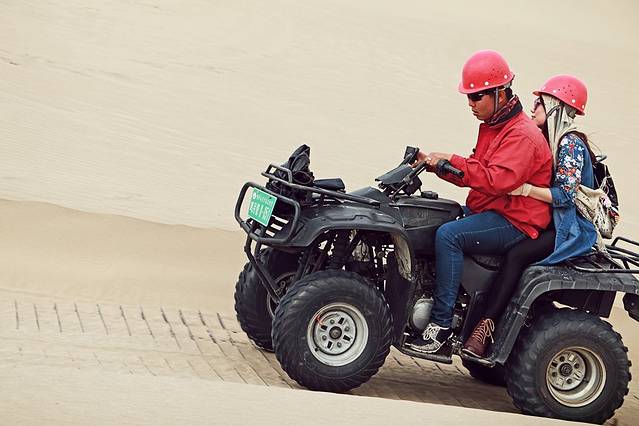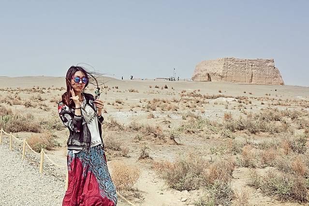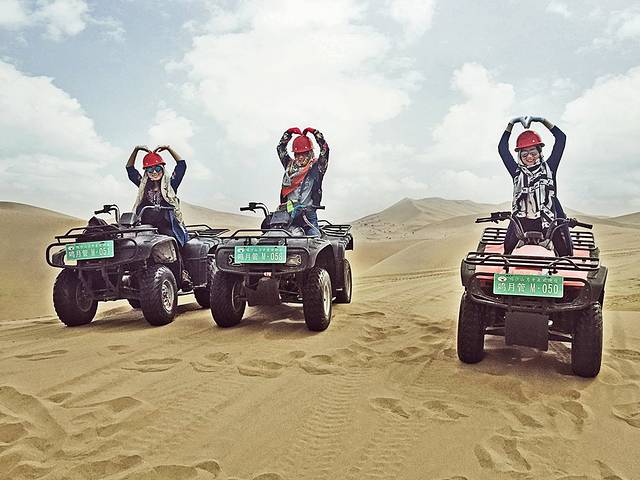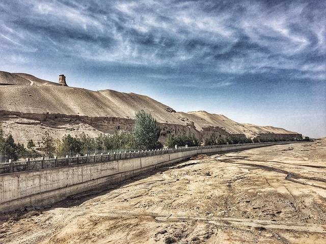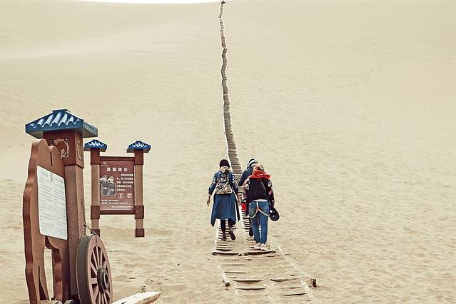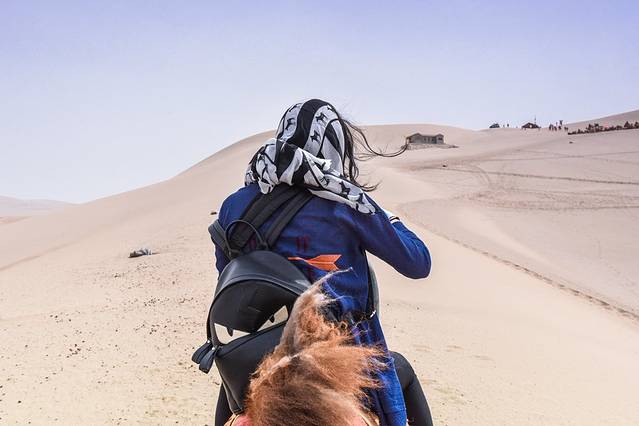 对于有目标没计划的我们来说,首先想到要去的景点当然是地标性的,于是我们隔天一早便往鸣沙山前行。去鸣沙山和莫高窟都不需要包车,这两个地方距离市区都只有二十多分钟的车程,出行很方便。