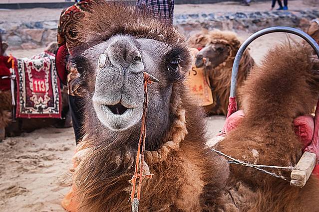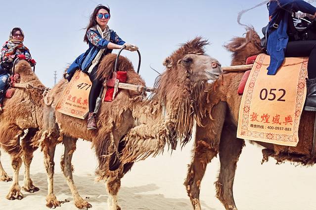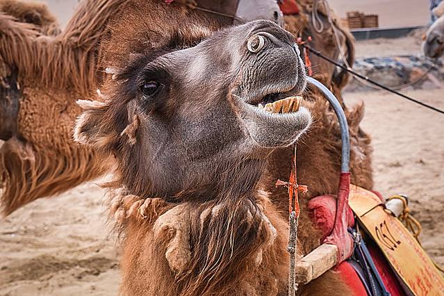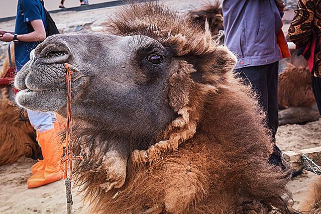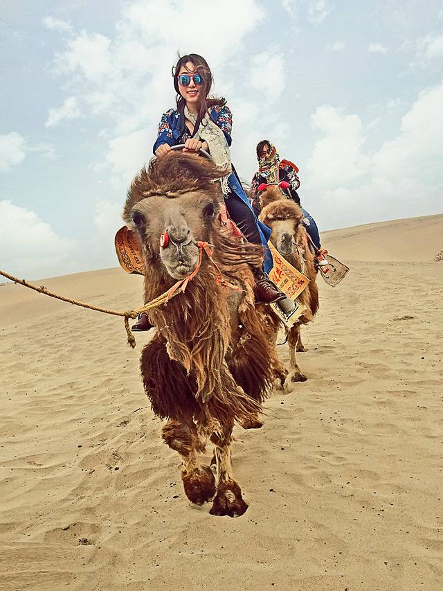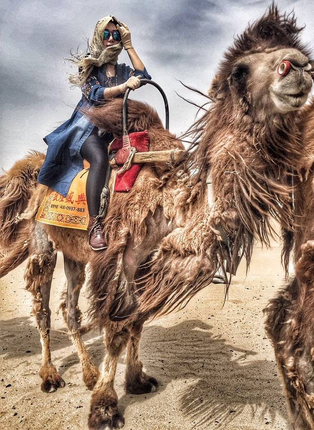 我们三个骑的骆驼每只个性都不一样,我骑的那只还算最乖的,lulu的那只特别调皮,我坐在它前面,它看到我双肩包上的装饰居然就啃了起来,主人阻止了几次都没有成功后,只能把我的包背到了lulu的身后。接下来要隆重介绍cj的那只骆驼,那是一只会做各种搞笑表情的骆驼,简直可爱到不行!