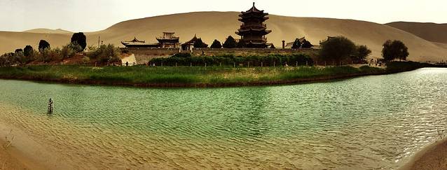 月牙泉的形状真的是一个很标准的月牙状,感叹大自然的鬼斧神工!我们绕着月牙泉走了一圈,能明显的看到原本的月牙泉比现在要大了很多,在泉水边缘的沙子颜色和其他地方不一样,真的好怕月牙泉越变越小,直到最后消失~