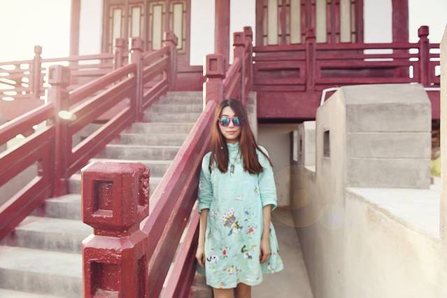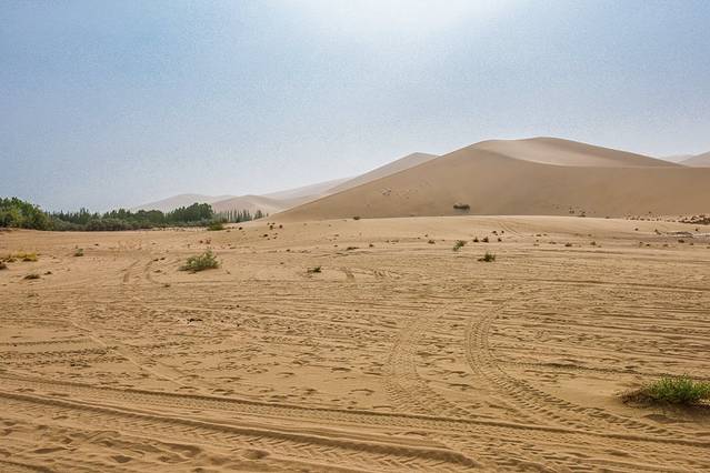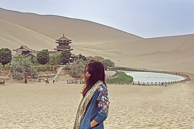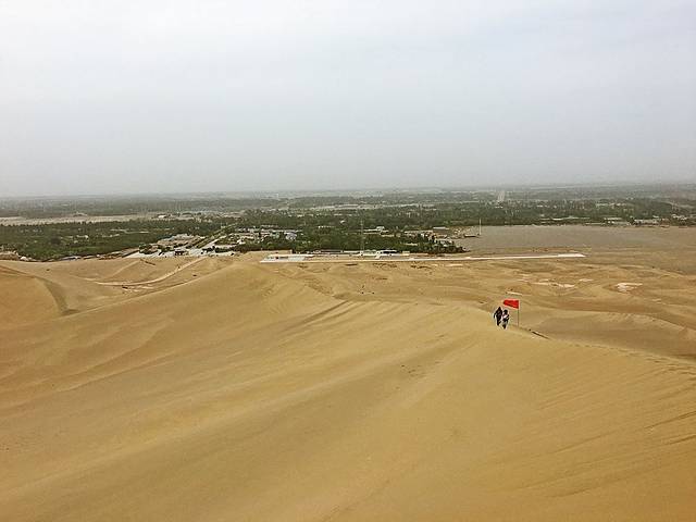 我们不知道有多傻,往前看了一眼,有一块类似于月牙形状的绿化带,以为那就是月牙泉,我们几个还特别失望的以为现在泉水都没了,我还想说要不要爬到山上去往下看看能不能看清楚点,差点就要放弃往前走的念头了~~