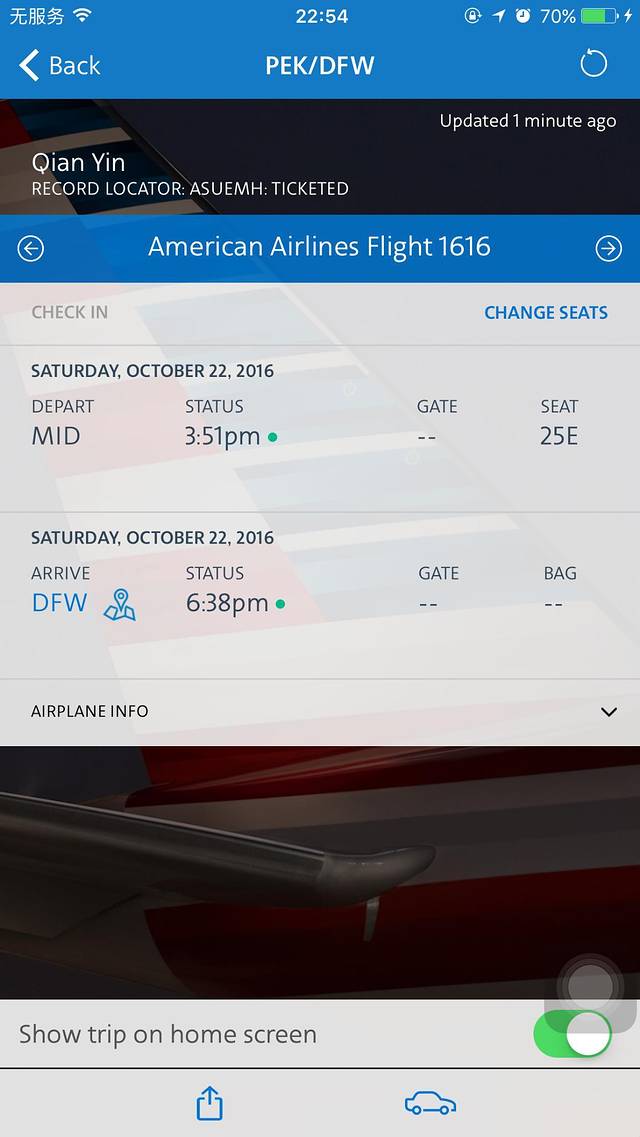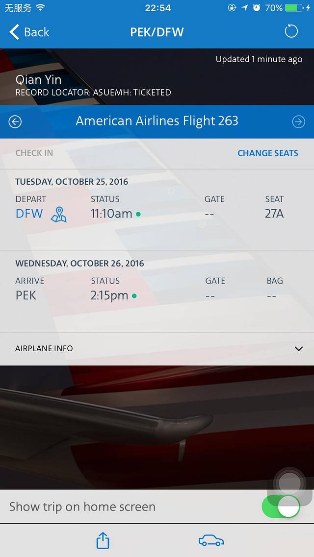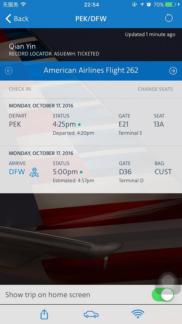 a.AA航空:因为AA航空不在中航信的系统里,所以航旅纵横需要手动添加,下载APP实时更新航班状态