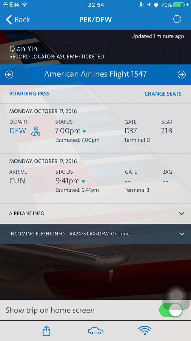 10月17日 达拉斯-坎昆 AA1547 19:00-21:41