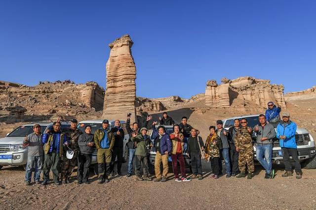 左起:1、哈密太阳旅游公司野外向导:阿龙;2、中国知名企业家、摄影爱好者:崔先生;3、哈密太阳矿业公司负责人:马先生;4、太阳旅游公司:李师傅;5、车坛影协会长助理:邵老师;6、中国摄影家协会:卢老师;7、中国陶瓷艺术家紫砂大师:王老师;8、哈密太阳(控股)集团董事长:尹先生;9、中国美术家协会:吴老师;10、清华大学美术学院:刘老师;11、文化学者:罗町子;12、艺术学者:小可;13、中国传媒大学博士生导师:潘教授;14、中国车坛摄影协会创始人:申会长;15-18、太阳公司随行人员:徐师傅、代主任、赵经理、买主任;19、香港MCA传媒集团《中国汽车卫视》:刘总裁;后排本文章原创者:尔建(RJ5333)。