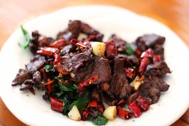 辣炒牦牛肉:牦牛肉本身的嚼劲十足,在辣子油炸锅之后,肉质表面又变得香辣脆爽