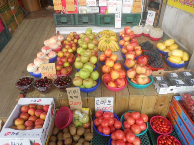 水果,贵的吓人,比烤肉还贵。。。一个桃子30元还难吃,买了两串葡萄好难吃可以吐出来,如果韩国人到中国来一定是幸福的。后来给了一个出租车司机,人家眉开眼笑的。。。