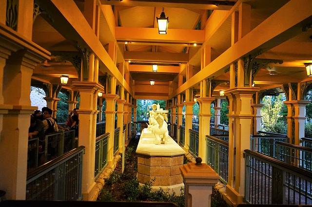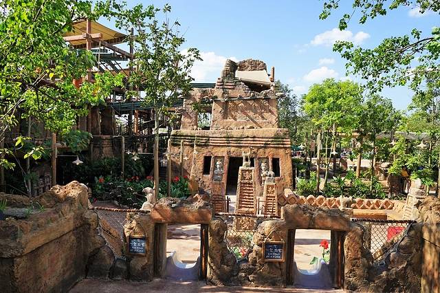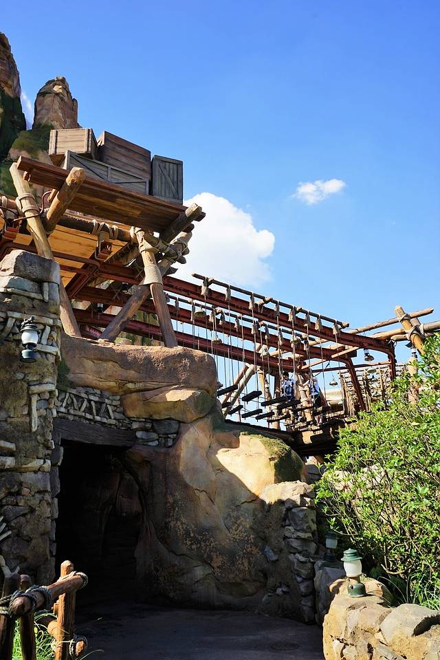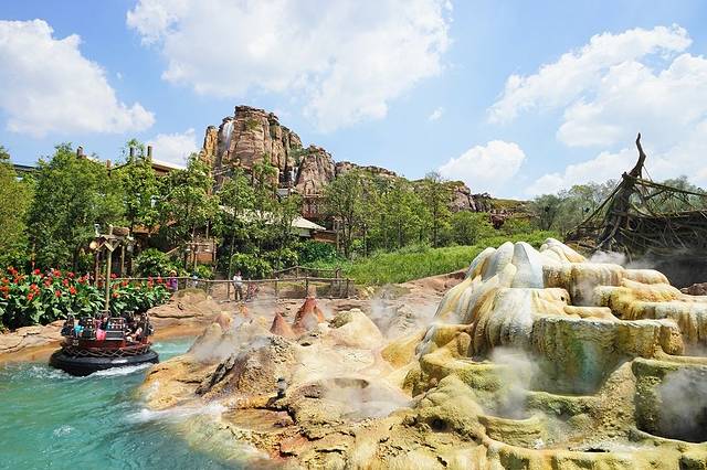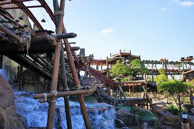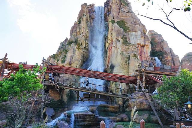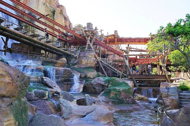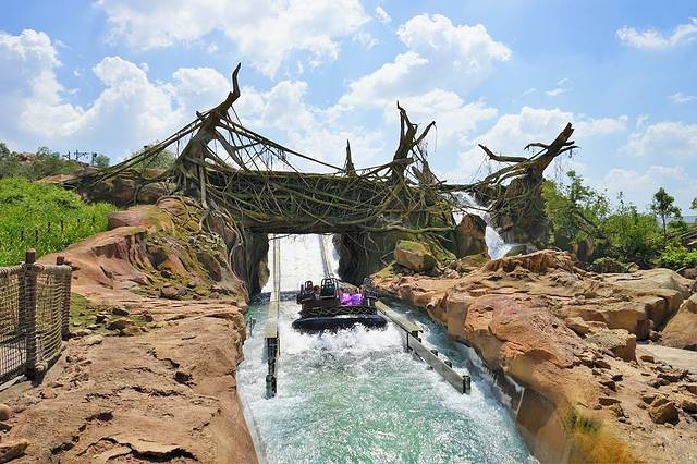 除了飞跃地平线,探险岛里最热门的项目当属雷鸣山漂流。乘上漂流筏,在山洞、山涧与漩涡之中漂流盘旋,然后俯冲直下...请收好你的手机相机,让水花尽情打湿你的衣衫、冲花你的妆扮...由于俯冲落差比东京迪士尼的小,所以惊险指数也不大,只要身高超过107cm都可以体验。