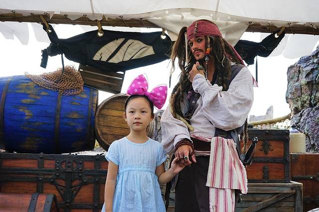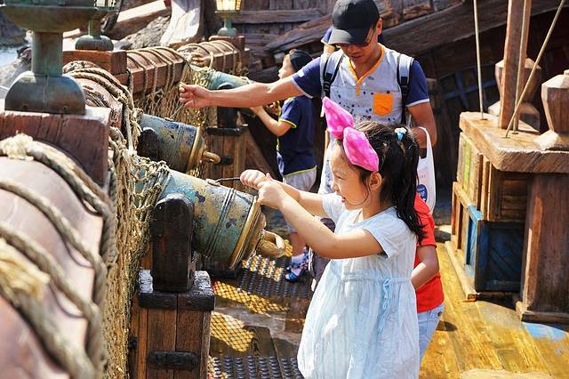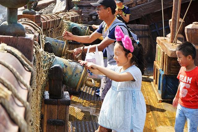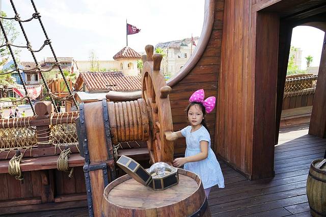 登上船,体验下海盗们的生活,转转舵、开开炮,眺望海面的渔船沉落的美景,亦或和大名鼎鼎的夹克船长来个合影。不知不觉,女儿已经转换了海盗的角色