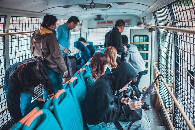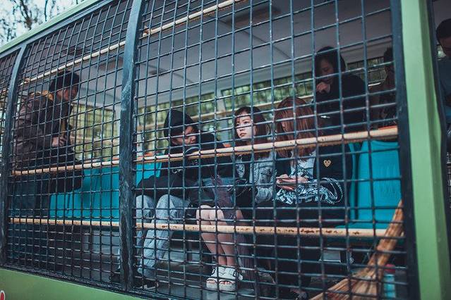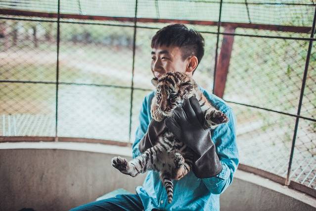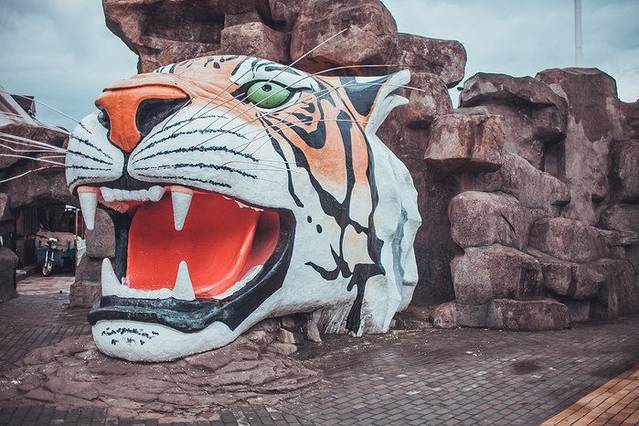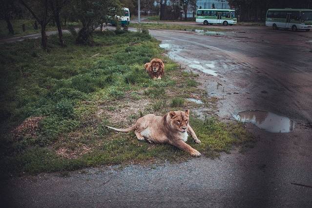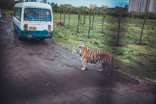 虎园里有专为游客准备的带铁栏的巴士。上面写着:惊险旅游从这里开始。游客们站在车里向外张望那些猛虎,老虎也肆无忌惮地冲向巴士虎视眈眈地看着游客。