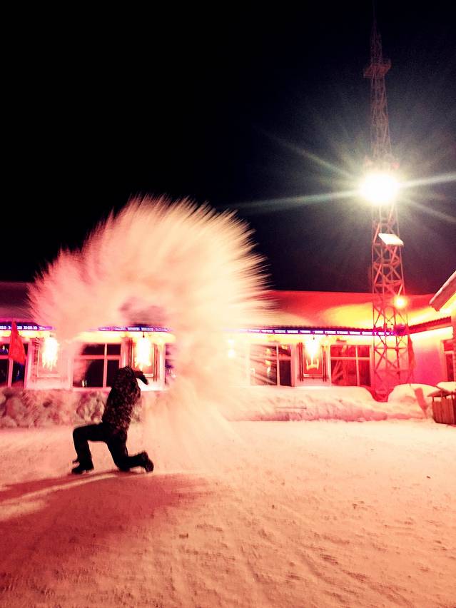 大晚上的,应小伙伴的号召,篝火晚会结束后,我们还在宾馆外的空地上尝试了泼水化冰雾的特技,哈哈,Duang Duang Duang,很带感有木有,当然我们也不是一次就成功,所以最后捕捉到胜利画面,可兴奋了。这份东北特产,走过路过不要错过,都来尝试下啊!~