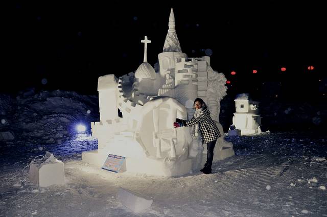 说起来这趟雪乡行,还意外赶上了大学生雪雕比赛,就在冰雪游乐园的对门,一座座下午刚刚完工的大学生雪雕比赛作品雪白精致,忍不住冲过去合影留念了一张,这座雪雕城堡是不是很有点哈尔的移动城堡的样子。