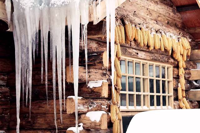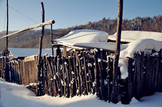 在零下二十多度的气温下,住在这里总是能看到一个有趣的奇观,就是开房门如同开冰箱一般,空气化作大大的白色气团一瞬间涌进房屋内,门框上结起一层厚厚的冰霜。听说以前,入冬了,住在这里的人早晨总是开不了门,因为门外厚厚的积雪经过一夜能有半人高,妥妥的堵住了去路,想想真的是一个美丽的麻烦。
