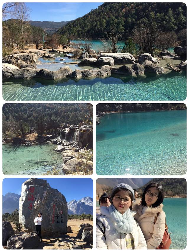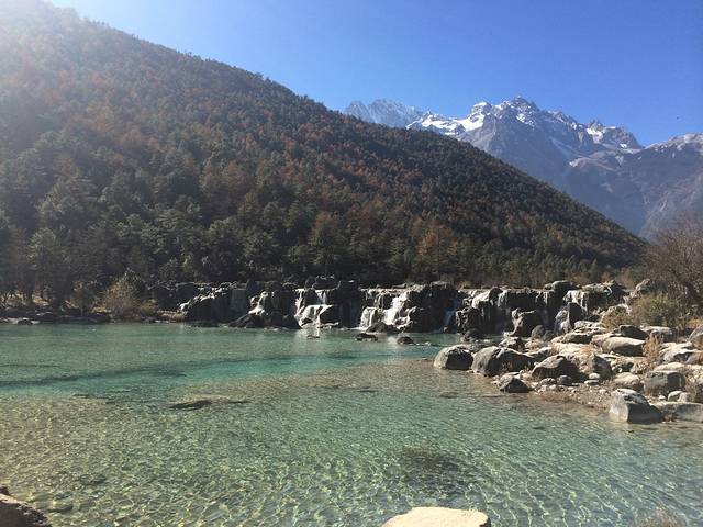 下了索道车,我俩坐环保车前往了蓝月谷,那湛蓝湛蓝的湖水,清澈见底,溪水潺潺,悦耳动听,旁边的山层林尽染,远处的雪山巍然屹立,醉心山水应该就是这种感觉吧!另外云山坪也是一个景点,我们没有去,听说夏天特别美。