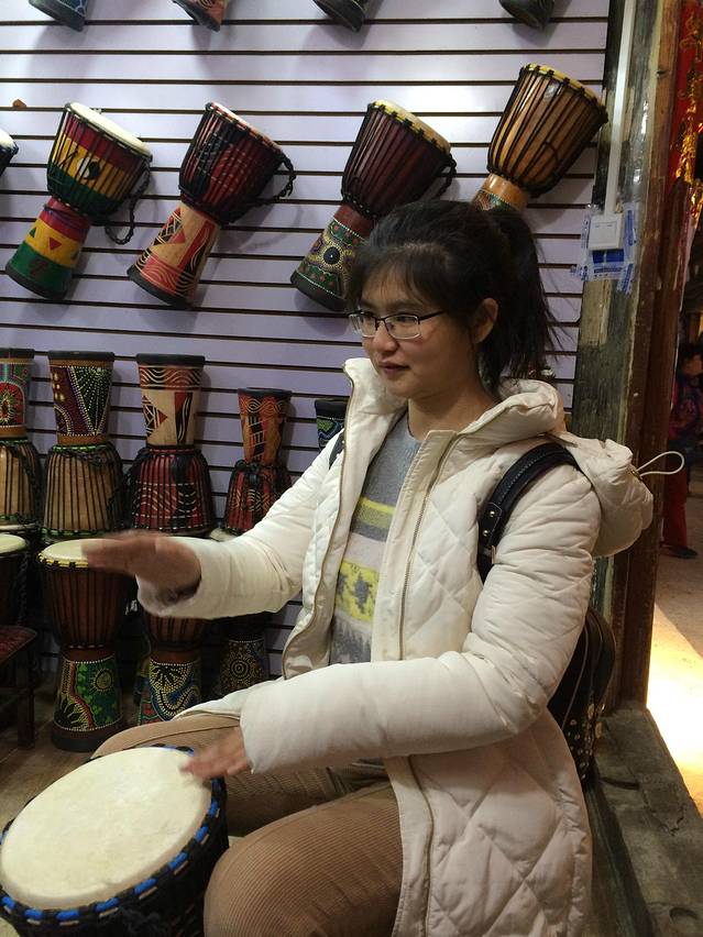 游玩了束河古镇,我俩6点钟回到大研古镇,我们晚上住这里,我们在一个手鼓店坐了一会儿,看店的小美女教我们玩了一会手鼓,我买了两套CD,是小倩的歌,来过丽江的人一定被她洗脑过,回到深圳后,每次听到这些音乐总有一种置身于丽江的感觉,以后如果有机会来做个手鼓姑娘也不错哇!