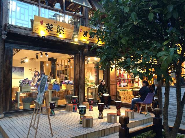 小桥流水,树木成荫,小花朵们都长出了自己的气息,微风拂过,我心里不禁的感叹,岁月你怎可如此温柔,不动声色的流淌着。我俩随意溜达着,满街的小店,虽然充斥着各色商品,但是却给人一种内心的安宁,手鼓店里传出的音乐,清丽。