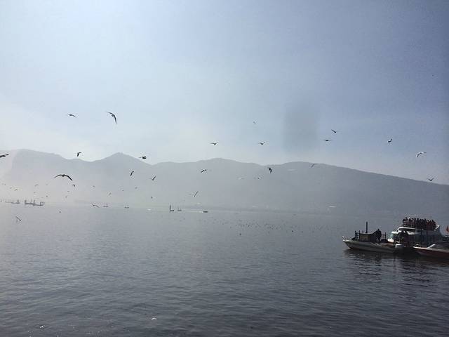 (滇池上成群的海鸥,雾气很重,远处的山若隐若现)